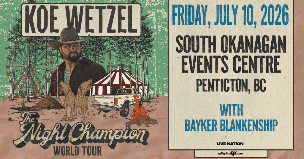 Pollstar’s “firebrand live sensation” Koe Wetzel returns to the road with the aptly named The Night Champion World Tour, making a stop at the South Okanagan Events Centre in Penticton, BC on Friday, July 10th, 2026. Joining him in Penticton as special guest is Bayker Blankenship.