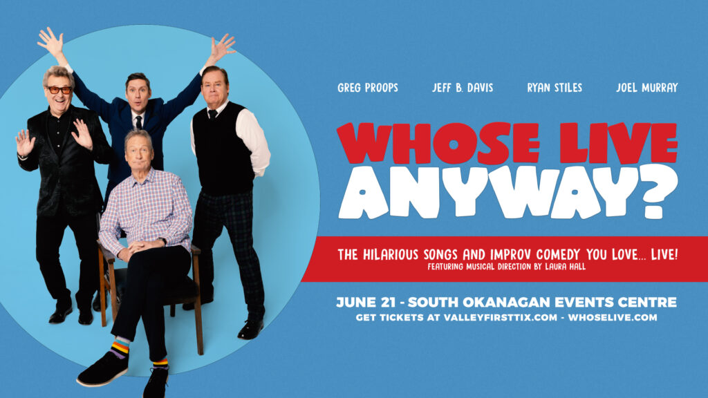 Penticton, BC | Get ready to laugh until it hurts! The cast members of the Emmy-nominated TV show Whose Line Is It Anyway? are bringing their all-new improv tour, WHOSE LIVE ANYWAY?, to the South Okanagan Events Centre (SOEC) in Penticton on Saturday, June 21, 2025. This show features Ryan Stiles, Greg Proops, Jeff B. Davis, and Joel Murray performing an evening of unscripted comedy and music, all based on audience suggestions. Audience participation is key, so bring your ideas—and you might find yourself on stage with the cast!