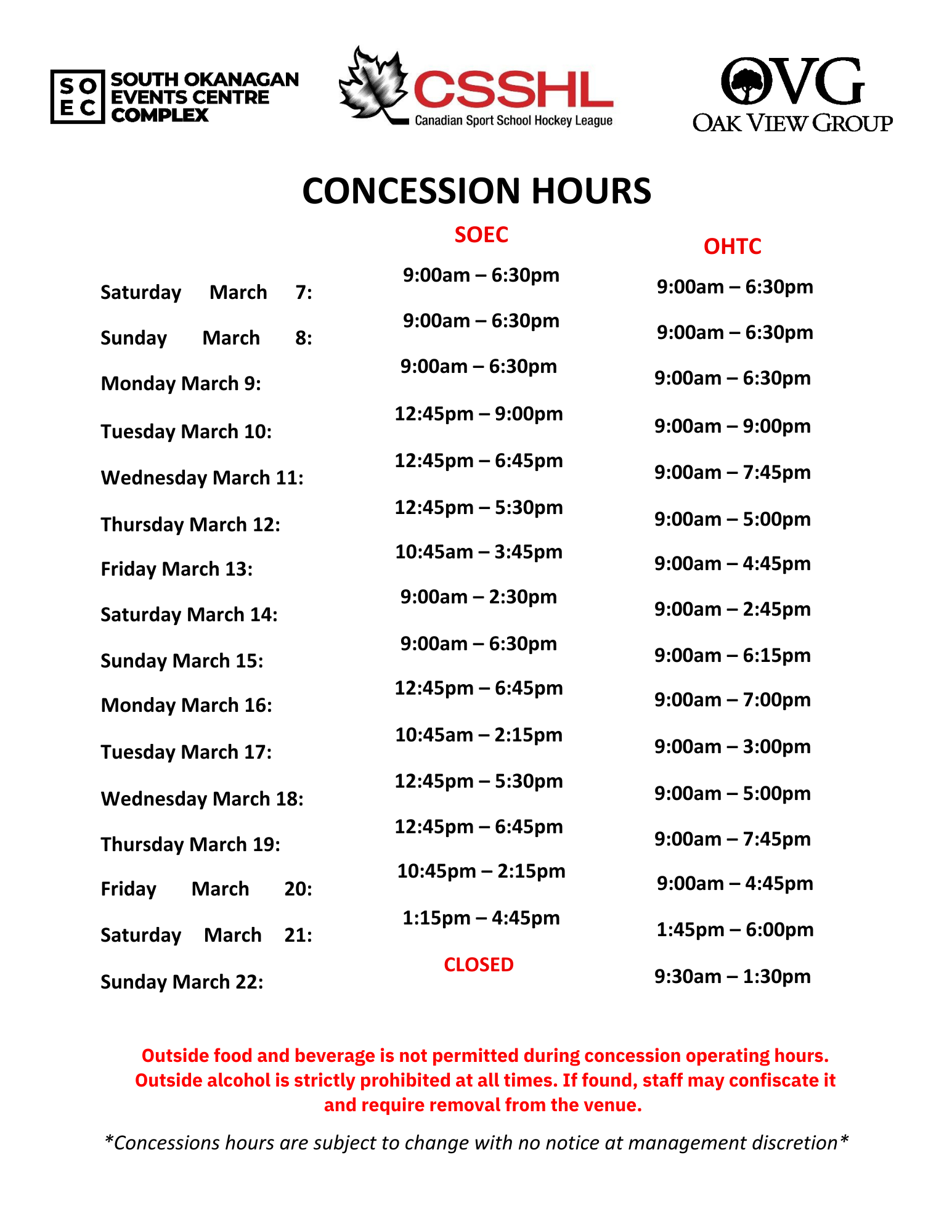 Concession stands located at the SOEC and OHTC will be open at venues serving food and beverages throughout the tournament. Cash and card are accepted.