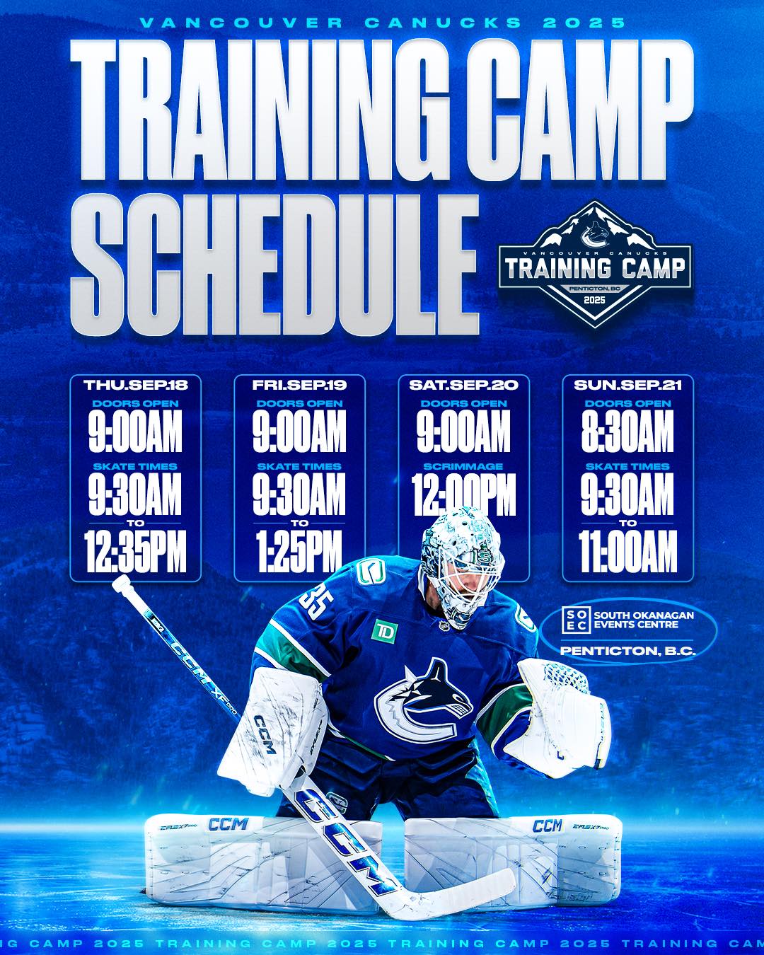 All on-ice activities will take place at the South Okanagan Events Centre (SOEC) from September 18-21, featuring daily skates and a Blue – White scrimmage on Saturday, September 20.